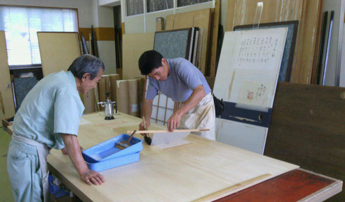 2階の作業所では永田さんが山田さんの指導を受け、裏打ちをしています。