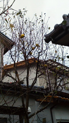 今朝、我が家のカリンの木。葉はわずかになって大きい実が7~8個残り、後は落ちたようです。
