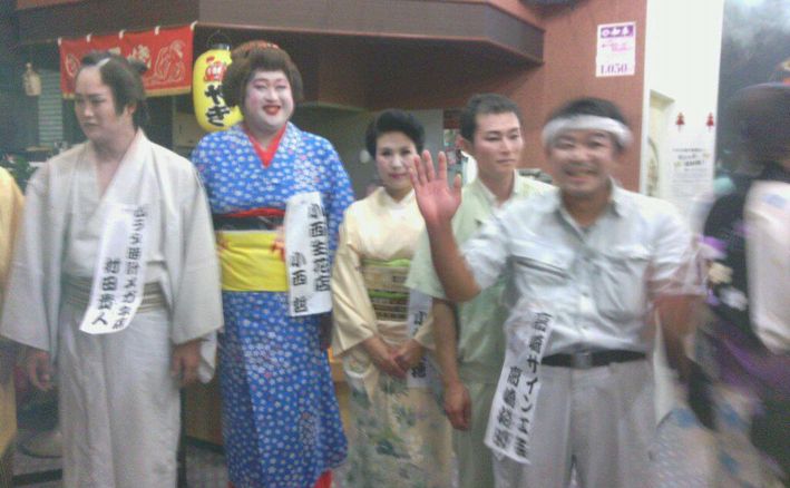 看板屋の高崎さん、若旦那役の村田時計さん、プロパン屋の小林美穂さん、花屋の小西さんと