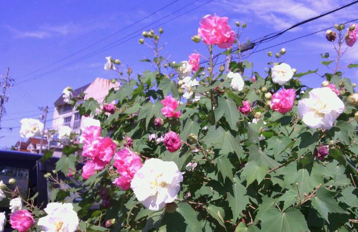 天候が良いので近くの田んぼ脇に咲いている酔芙蓉。色鮮やかで空の色にも映えて美しいですね。
