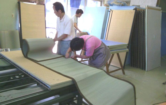畳の作業所では畳表に縁付けした仕上がりを畳職人の高田さんが点検しています。