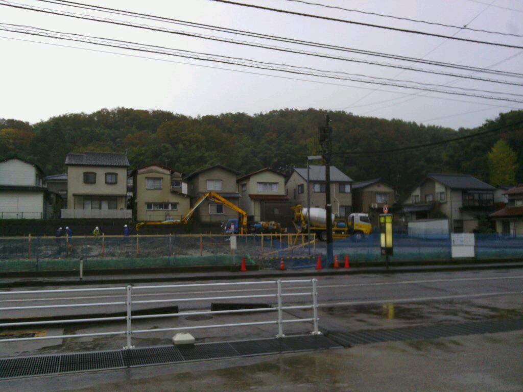 会社前の工事現場では、冷たい雨の中でもコンクリートの基礎作業をしていました。
