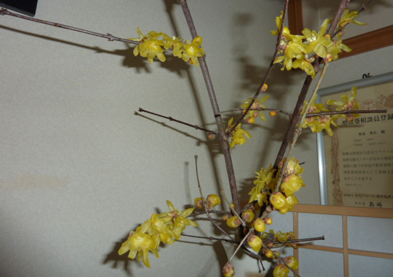 正月に一枝花瓶に入れたが、蕾が堅く開花しない為、会社の玄関に飾って見ました。