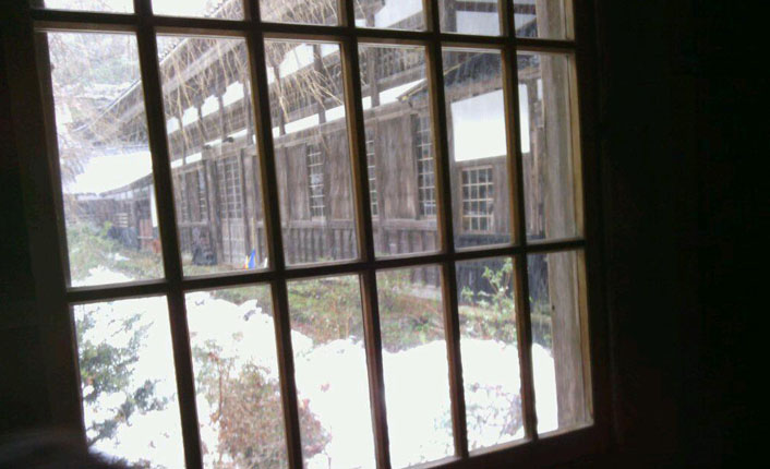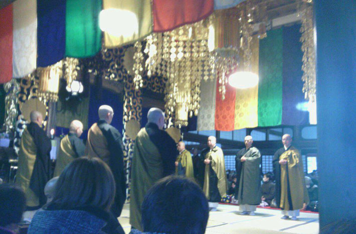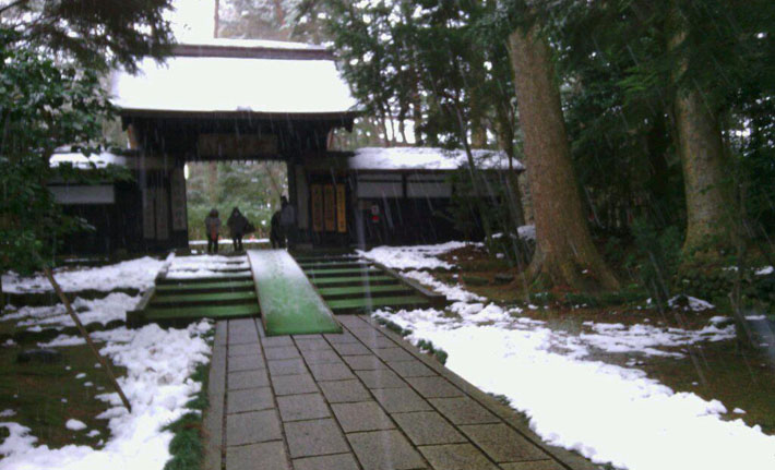 そんな中、法堂から窓越しに庭園を見れば綿雪が静かに降り、室内の行事とは対照的な風景であった。