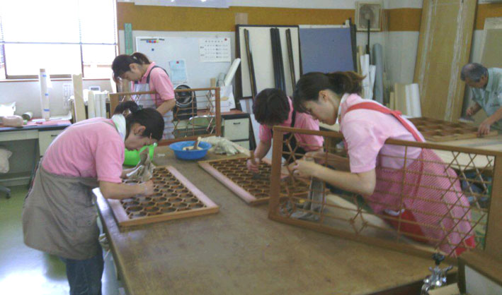 女性陣がお手伝いで障子の細かい桟までも一つ一つ拭いております。