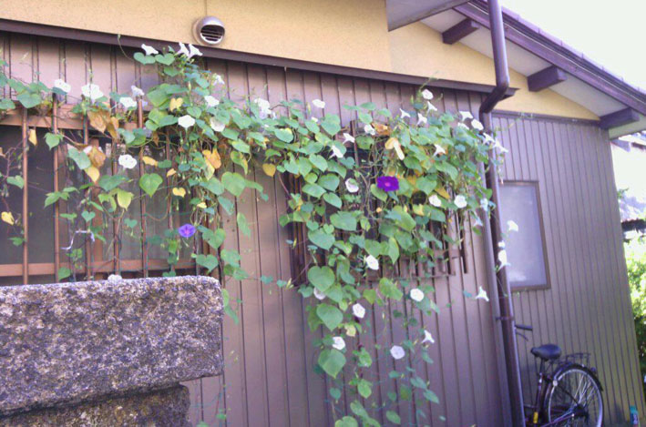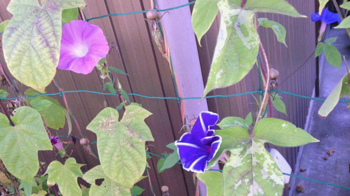 今年は朝顔、ふうせん葛、ゴーヤの混合で植えたところ、未だ生き生きしています。