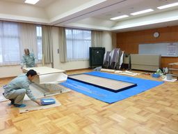 先頃 裏打ちした書を現場にて画に貼る作業の準備中。