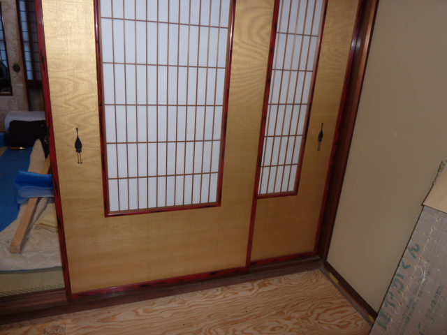 P1090788.JPG座敷側の襖戸は、絹製で引手は目出たい鶴の形。