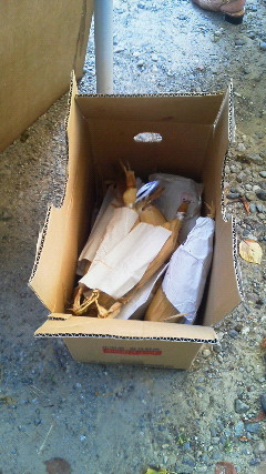 この箱は使用したトウモロコシ。1年間守って下さったのをお返しします。