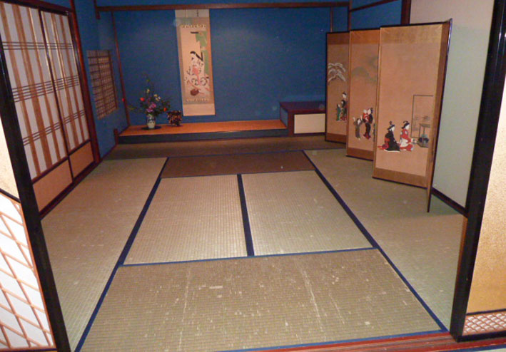 室内の壁は群青色、畳表、縁も青い色で統一されています。