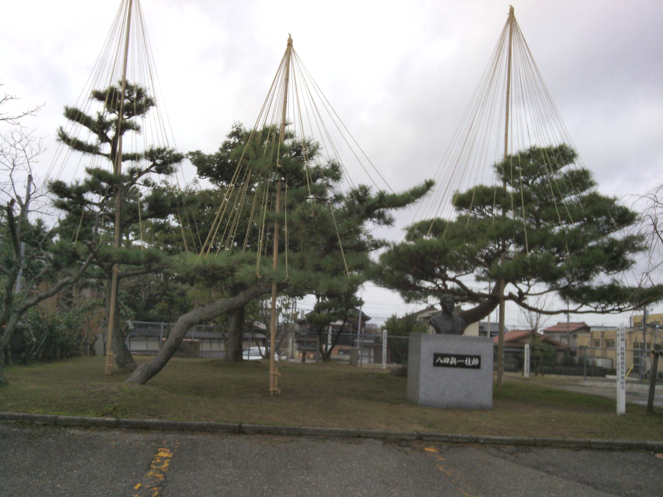 小学校さんの前庭に 雪吊りの間に八田与一氏の銅像を見つけたので、最近御縁があるので