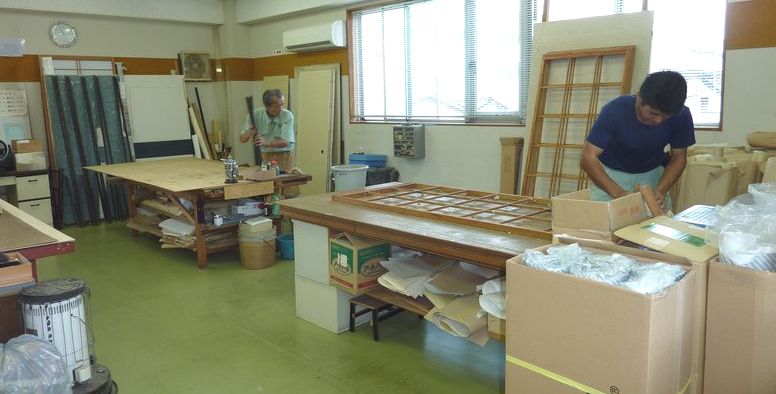 2階の襖作業所では、山田さんが襖を、永田さんが障子の貼替作業中です。