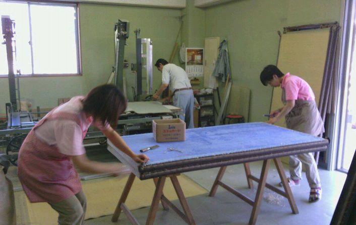 おかげさまで、畳の作業所が忙しくなってきたので、今日は女性陣にも応援をたのみ、框ほどき(畳表をはがす作業)のお手伝いです。