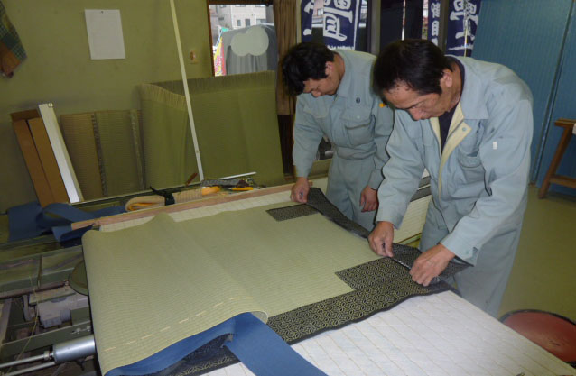 畳の作業所では市内のお寺様より四天拝敷2枚のご注文を頂き、高田さんと喜多君で準備しています。