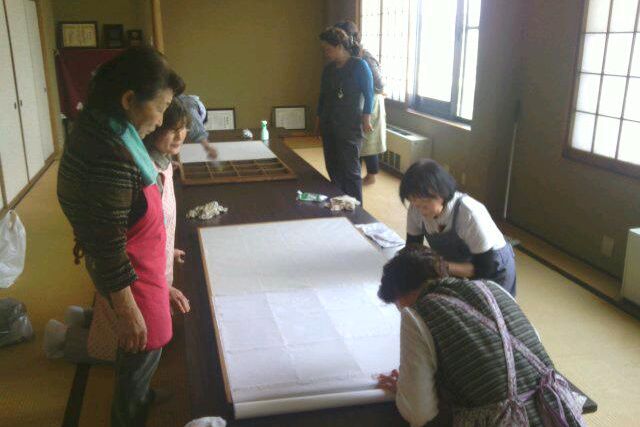 道具や定規が揃っていないので、皆、頭を寄せ合い↓しての作業です。