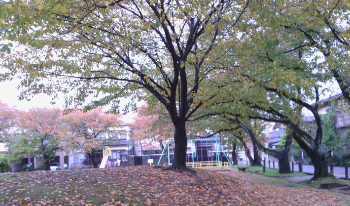 桜や楓の葉が紅葉し、落葉も色とりどりで美しい光景です。