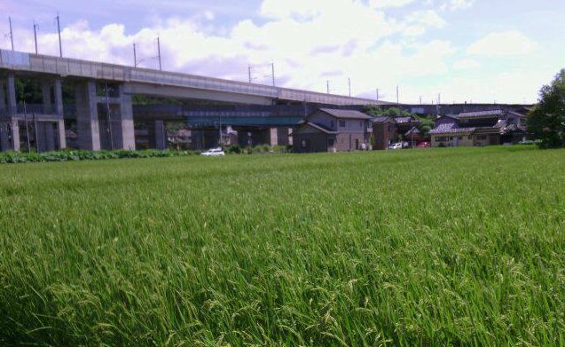 向側の陸橋は2年後に開通する北陸新幹線用で、その下を交差する道路は北陸自動車道。