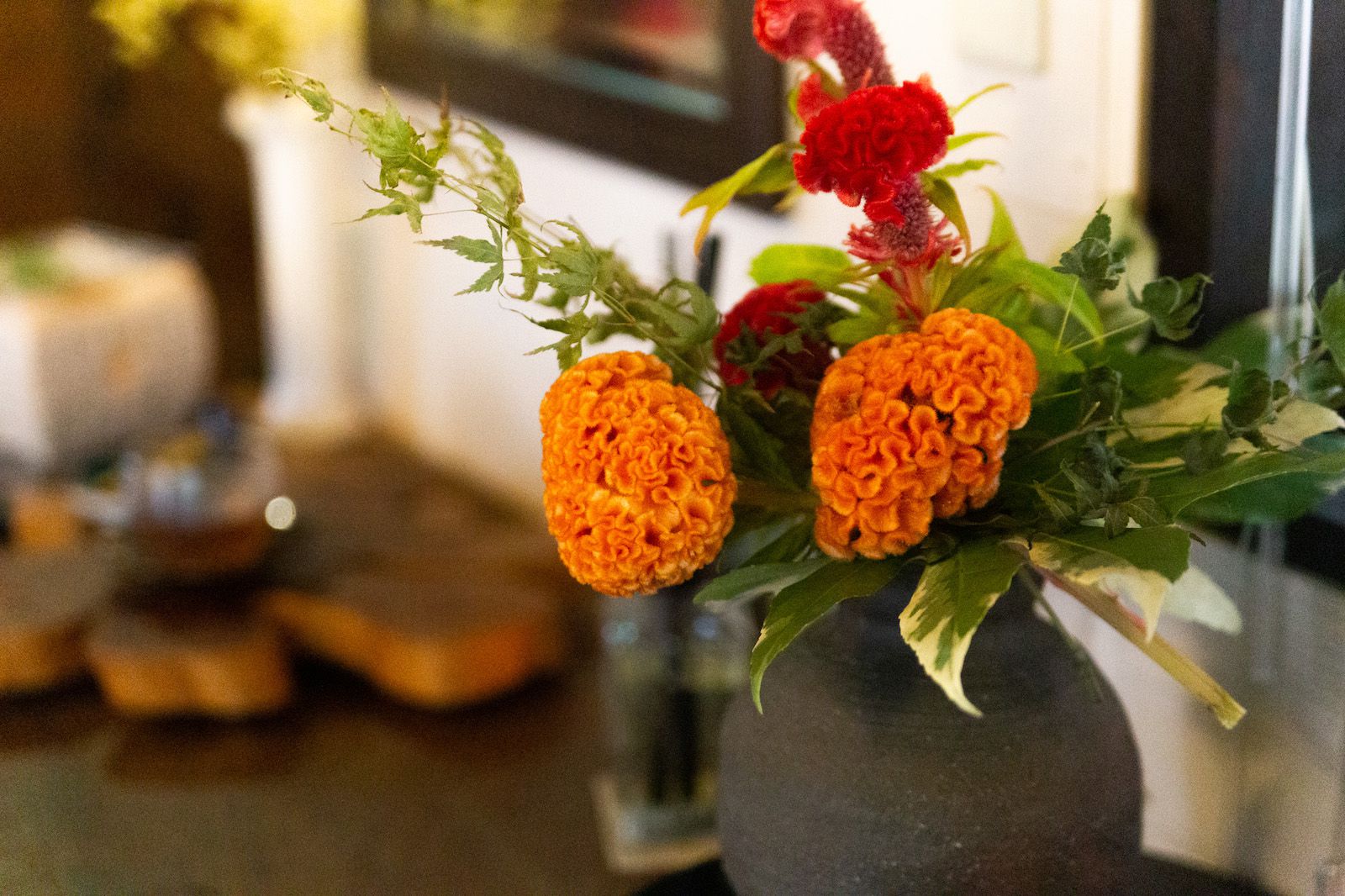 エステサロンのオープンに合わせて、玄関とその外観もリフォームすることにしました。以前は白色だった外観。思い切って木目を基調とした外壁に変更し、重みのある色の引戸を合わせることで、外観と調和が生まれました。瓦で作った看板の上にあるレトロな電灯は、松永が提案。玄関を入ると、生け花の先生であるお母様が生けたお花が、凜々しい姿で出迎えてくれます。廊下は全面漆喰でしたが、半分より下に木目の入った木を入れて、外観との統一感を出しました。