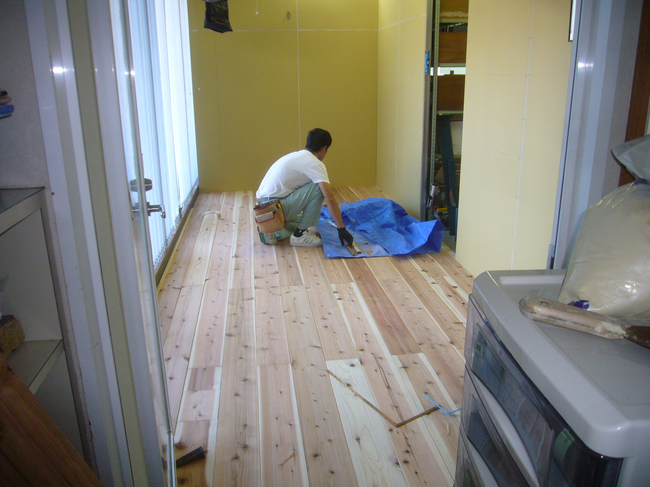 まだ途中段階ですが、壁をクロス貼りにし、床をタイルカーペットから木材に取替ました。(^○^)