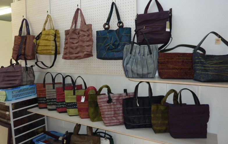 社内で展示販売中のヘリバッグ。