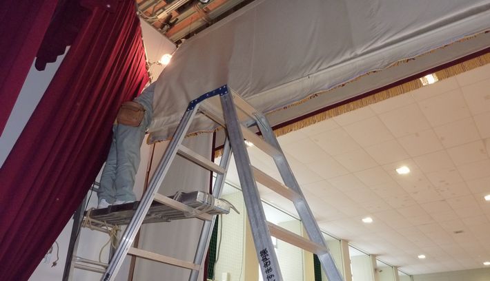 すぐ後ろには緞帳もあり、作業者は体の上部を幕の上端まで入れての作業です。